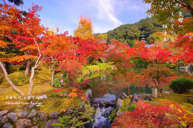 ▼「苔敷斜暉楓染錦,葉舞金風菊花黃,佛塔古池澄秋空,山水鏡映永觀堂。 」